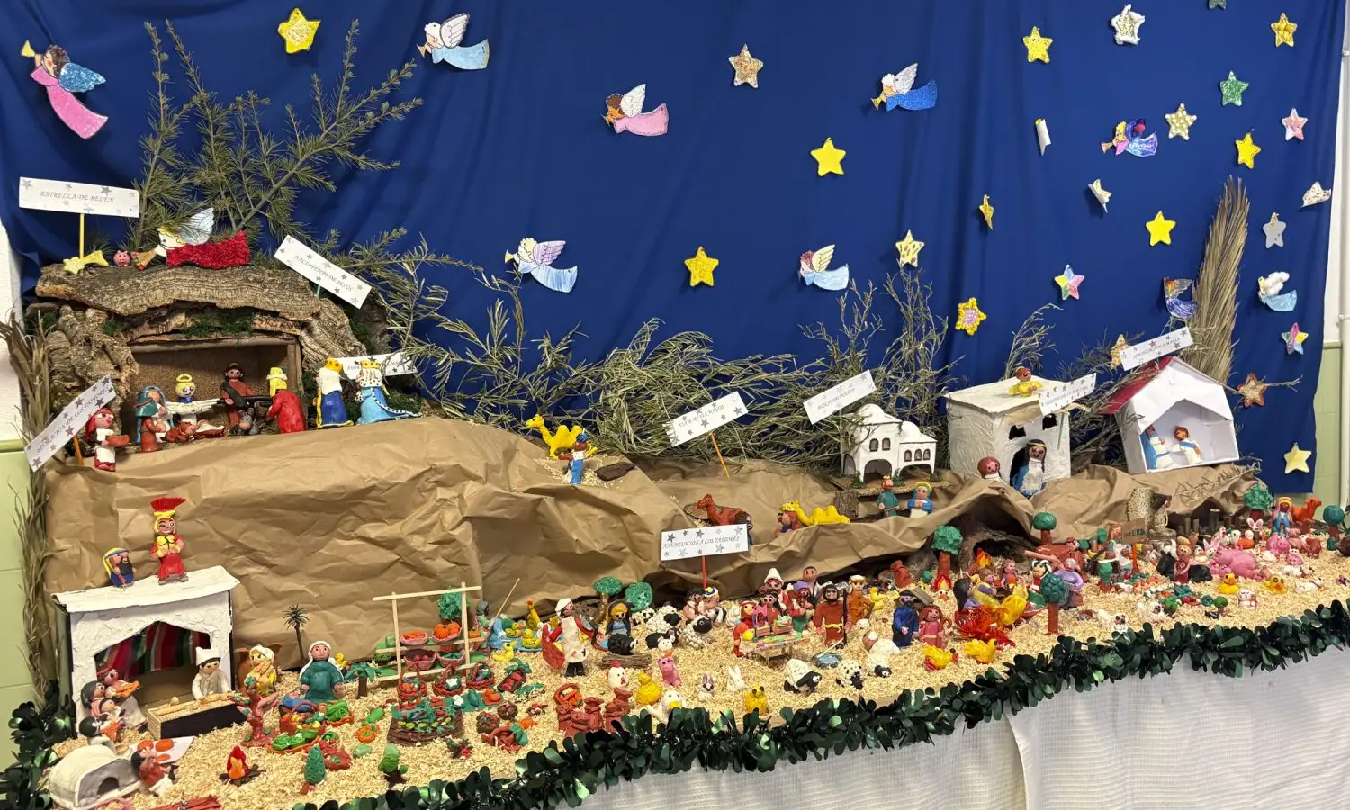 En la XV edición de En Belén de Judá uno de los tres centros ganadores ha sido el Colegio Santa Ana de Jumilla, donde han diseñado cada figura del nacimiento con plastilina. «La elaboración de los personajes del belén ha sido un esfuerzo en conjunto de los niños de Educación Infantil y sus padres, mientras que las construcciones las realizaron alumnos de Educación Secundaria», detallaban en su candidatura. El Colegio San José de Calasanz de Yecla también ha utilizado la misma técnica para el montaje de su belén resultando igualmente premiado junto al Colegio Nuestra Señora de la Asunción de Jumilla. Además, el jurado ha hecho dos menciones especiales: para el CEIP Alfonso X el Sabio de Yecla, cuyo belén fue elaborado de manera conjunta por profesores, padres y personal de administración y servicios, incluyendo cartelería explicando las cuatro escenas; y para el IES Federico Balart de Pliego, con su nacimiento realizado con cartones y pinturas. «Los alumnos lo pasaron muy bien trabajando en equipo, utilizando materiales de otros años y diferentes técnicas», explica Isabel García, profesora de Religión.