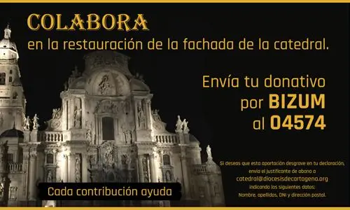 El Cabildo Catedralicio anima a toda la Diócesis a colaborar económicamente en la restauración de la fachada de la catedral. Quienes quieran podrán hacer su donativo por Bizum, en el apartado Hacer un donativo, al 04574. Además, aquellas personas que necesiten que su donativo desgrave en la declaración de la Renta, deberán enviar un justificante de abono al correo catedral@diocesisdecartagena.org indicando los siguientes datos: nombre, apellidos, DNI y dirección postal.