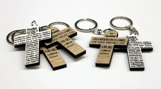 En una de sus caras de madera lleva inscrito el Padrenuestro y, en la contraria, «yo colaboré con la restauración de la ermita de San Isidro de Doña Inés (Lorca), 2023». Así son las cruces que, en forma de llavero, se están vendiendo en favor de la reparación de esta ermita. Se fabrican artesanalmente en la propia pedanía lorquina, de forma altruista; y, gracias al esfuerzo de vecinos y amigos, su venta ya supera las 2.500 unidades.