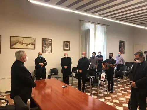 El obispo de Cartagena, Mons. José Manuel Lorca Planes, se ha reunido esta mañana con el rector, los formadores y seminaristas del Seminario Misionero Redemptoris Mater para interesarse por cómo están viviendo este tiempo.