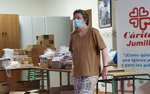 Trabaja como administrativa en la oficina de una empresa de reparación de todo tipo de maquinaria y, aunque se considera en primer lugar voluntaria, también es la directora de esta Cáritas interparroquial. Junto a su compañera Irene, y en coordinación con Cruz Roja y los Servicios Sociales de Jumilla, desde que se declaró el estado de alarma por la pandemia de Covid-19, recibe durante todo el día muchas llamadas, ya que surgen “cosas de toda índole y hay que estar disponible las 24 horas”. Realiza así una labor muy amplia: desde preocuparse por el suministro de mascarillas, organizar el reparto de productos de primera necesidad, y dar información sobre higiene y desinfección, hasta ayudar en la búsqueda de empleo a aquellos que se encuentran en situación o riesgo de exclusión social.