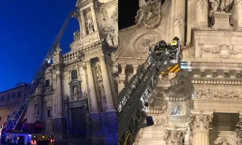 En la tarde de ayer, sobre las 20:30 horas, se produjo un desprendimiento de pequeños fragmentos de piedra y arenilla de la fachada de la Catedral. La Policía Local acordonó la zona de la puerta de San Juan Bautista, frente a la que se encontraron estos restos y los bomberos inspeccionaron, hasta en dos ocasiones, la fachada del templo catedralicio asegurando que ninguna pieza corría peligro.