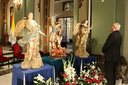 Desde hace unos días, los arcángeles de Salzillo –san Miguel, san Gabriel y san Rafael–, tres imágenes del siglo XVIII, se encuentran en la Parroquia Santa María de Gracia de Cartagena para su culto y veneración. El pasado viernes, coincidiendo con el regreso a este templo de la Cruz de Lepanto tras su restauración, el obispo de Cartagena, Mons. José Manuel Lorca Planes, se mostró emocionado y alegre por los cartageneros, que ahora podrán disfrutar de este importante legado artístico digno de ser resaltado. «Qué suerte han tenido los cartageneros, porque gracias a las Hijas de la Caridad estas tres grandes obras de Salzillo –entre las pocas que de él se conservan en Cartagena–, vuelven a estar cerca de los fieles para que las contemplen y veneren».