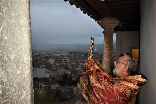 Durante este tiempo de pandemia se están realizando diferentes signos para pedir a Dios por los enfermos, por los fallecidos y por todas las consecuencias que está provocando esta pandemia producida por el Covid-19. Desde hace unas semanas, el rector del santuario de la Vera Cruz de Caravaca, Emilio Sánchez, realiza la bendición con el Lignum Crucis, desde el santuario hacia los cuatro puntos cardinales. Una bendición que se hace en Caravaca dos veces al año: el 5 de mayo, cuando la Vera Cruz regresa en procesión a su santuario después de las fiestas patronales que se celebran en su honor; y el 14 de septiembre, en la fiesta de la Exaltación de la Vera Cruz.